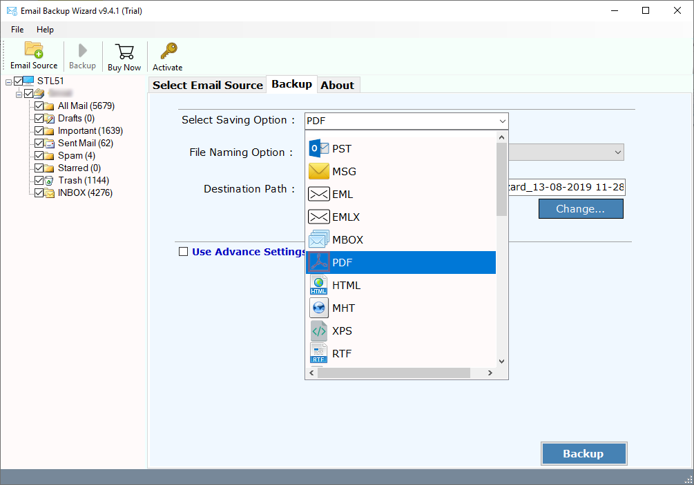 - Check the filter option for the advance method and hit the Backup tab.