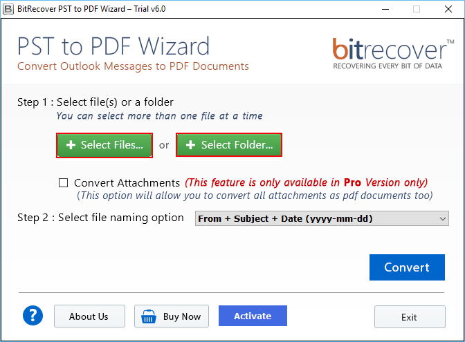 Stavo cercando su internet per trovare il modo giusto di inviare le e-mail PST in PDF con il supporto per la conversione in batch. Il software è in grado di convertire tutte le e-mail PST in più formati PDF senza affrontare alcun problema e richiedere alcuni secondi e sforzi. Grazie BitRecover!!!!!!