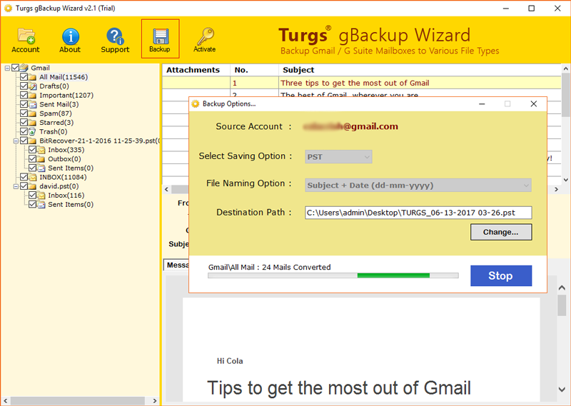 Download gratuito La versione di prova del software di backup di Gmail può facilmente eseguire il backup dei dati di posta elettronica dell'account Gmail nel formato desiderato e nella posizione desiderata nella memoria del computer e utilizzare lo scopo offline. La versione demo del software di backup di Gmail può eseguire il backup e il ripristino o salvare solo 25 messaggi di posta Gmail in formato client di posta elettronica con backup di posta elettronica avanzato.