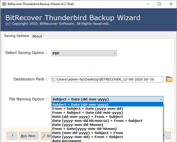 Stavo cercando uno strumento di soluzione di backup che possa facilmente eseguire il backup di Mozilla Thunderbird automaticamente e ottenere il risultato su un diverso formato di file e lo stesso formato di file. Cerco e ho ottenuto il software di backup BitRecover Thunderbird può facilmente eseguire il backup dei miei dati di casella di posta thunderbird in diversi formati di file. Un così grande strumento per salvare facilmente le mail di Thunderbird.